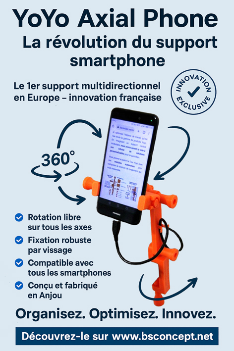 YoYo Axial Phone est le premier support smartphone multidirectionnel en Europe. Développé sur 6 mois, il offre une rotation libre à 360°, une fixation robuste et une compatibilité universelle. Conçu et fabriqué en Anjou, il illustre l’innovation locale appliquée aux nouveaux usages numériques.