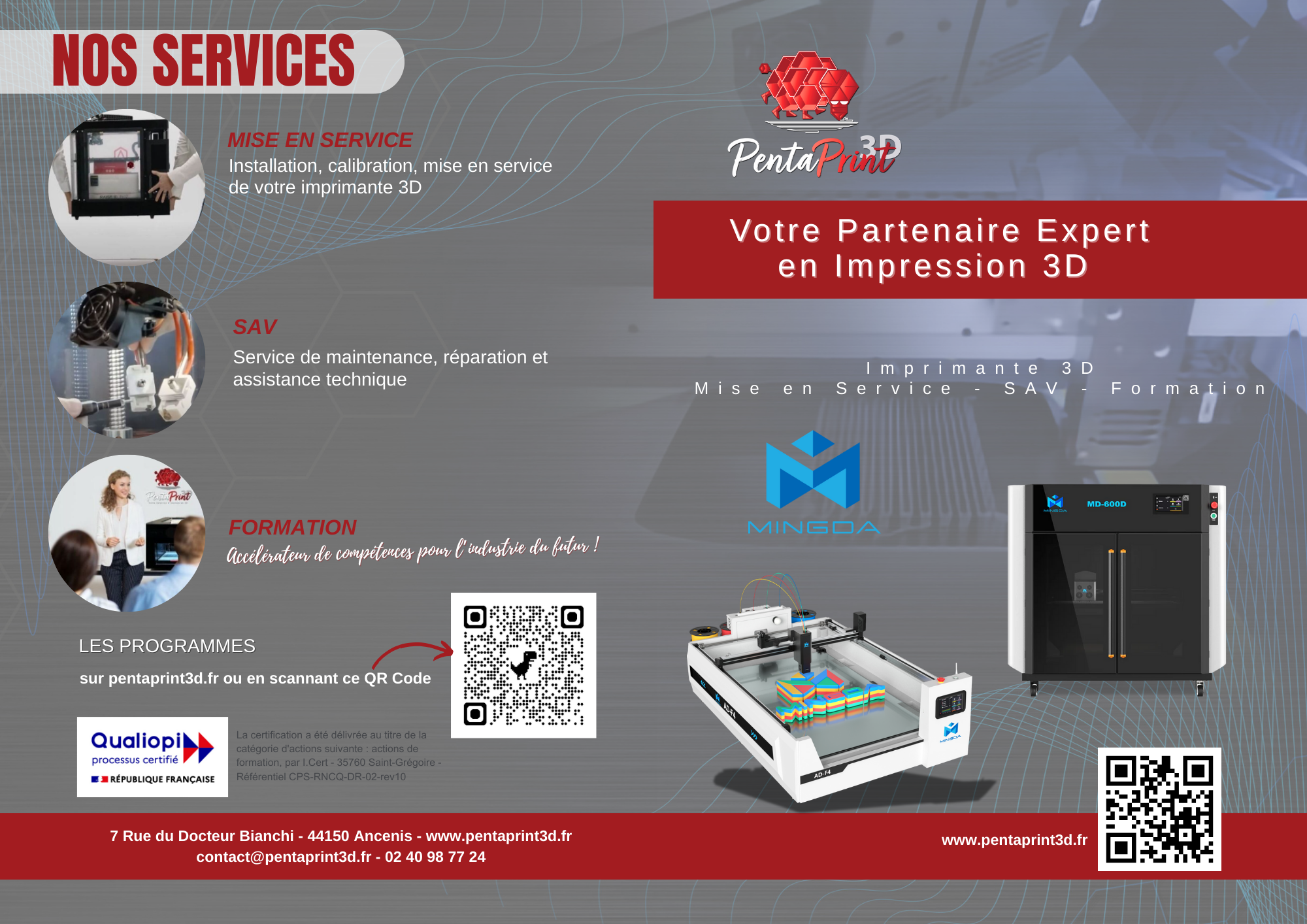 Chez Pentaprint 3D, nous proposons une gamme complète d'imprimantes 3D industrielles, professionnelles, grand volume et de bureau. Mais notre engagement ne s'arrête pas à la vente. Nous vous conseillons pour choisir l'équipement qui correspond parfaitement à vos besoins et vous accompagnons tout au long de votre projet, de la mise en service à l'optimisation de vos pièces.