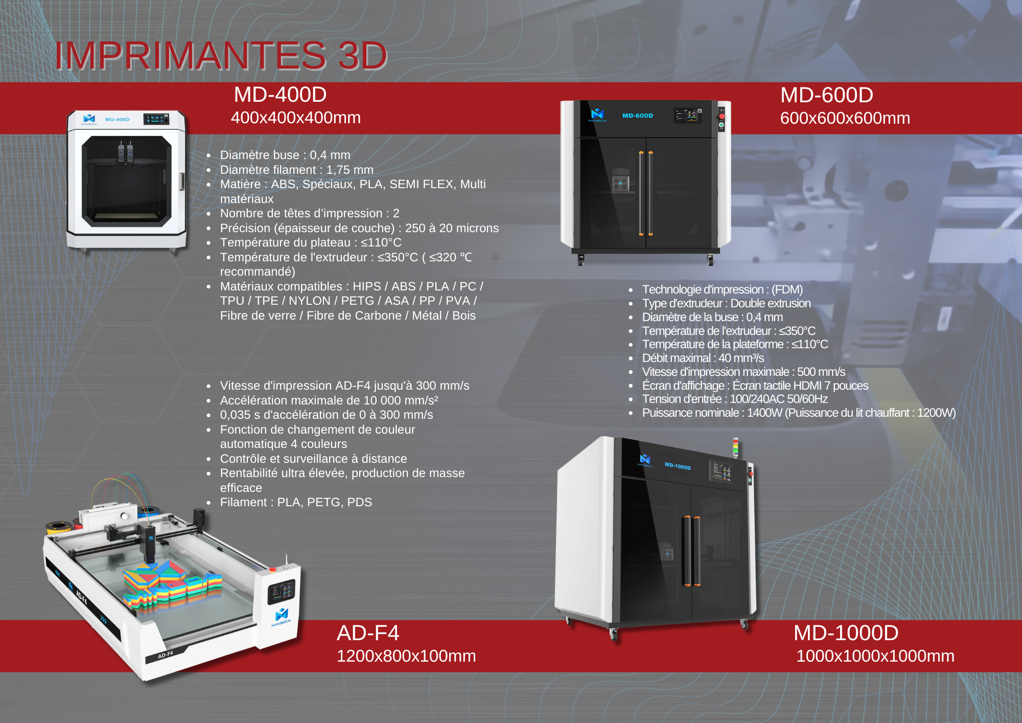 Nous assurons la mise en service du matériel 3D, vous proposons des formations approfondies et mettons à votre disposition un service après-vente réactif pour le dépannage. Enfin, vous trouverez sur notre boutique en ligne une large sélection de consommables de qualité, incluant des filaments et des résines 3D de grandes marques à des prix compétitifs.